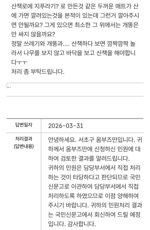 제가 방치된 분변 문제로 구청에 문의를 한 적이 있어요.