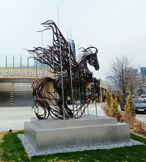 공원 입구에는 '바람의 천마'라는 멋진 말 조형물이 설치되어 있어요.