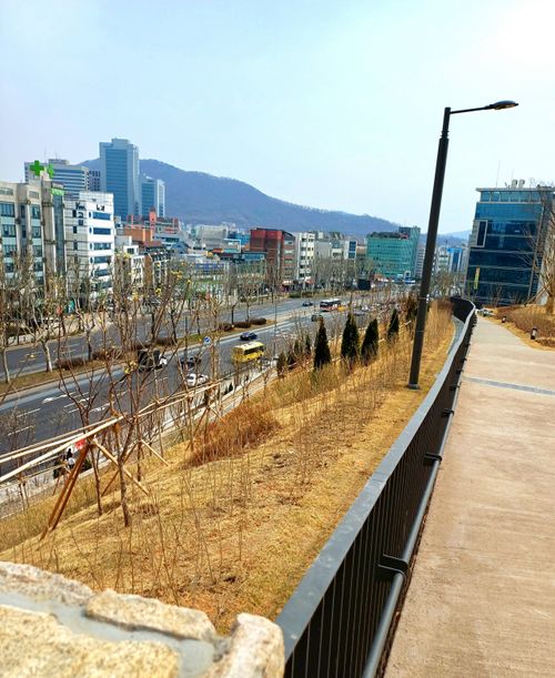 계단을 따라 올라가면 강남대로가 내려다 보이는 옥상정원이 조성되어 있더라고요.