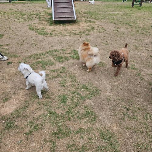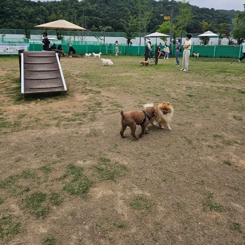 귀여운 푸들과 포메라니안, 마르티스 등 친구들이 한데 어우러져 노는 모습이 정말 사랑스럽지 않나요? 놀이터 한쪽에는 강아지들이 오르내리며 훈련하거나 놀 수 있는 '어질리티' 기구(경사면)도 설치되어 있습니다. 처음에는 낯설어하던 아이들도 다른 친구들이 타는 모습을 보고 금방 따라 하며 즐거워하더라고요.