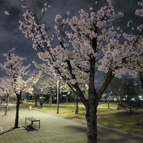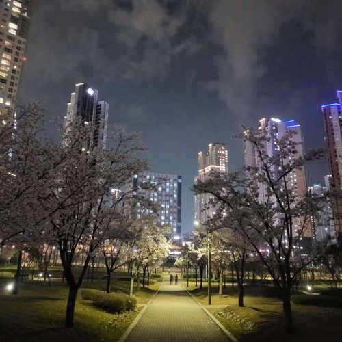 공원에 들어서면 가장 먼저 시선을 압도하는 풍경입니다. 쭉 뻗은 산책로를 따라 양옆으로 가로등 불빛을 받아 하얗게 빛나는 벚꽃나무들이 터널을 이루고 있습니다. 저 멀리 보이는 도심의 고층 아파트들이 벚꽃과 어우러져, 마치 미래 도시 속에 숨겨진 비밀 정원을 걷는 듯한 몽환적인 분위기를 자아냅니다. 연인들의 데이트 코스로도, 가족들의 저녁 산책 코스로도 이보다 더 완벽할 수 없습니다.