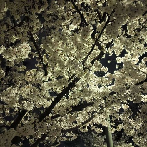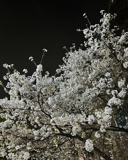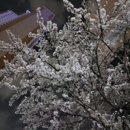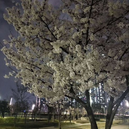 가로등 불빛이 벚꽃잎 하나하나를 비출 때의 그 아름다움은 말로 다 표현할 수 없습니다. 벚꽃나무 한 그루를 가까이서 담았는데, 칠흑 같은 밤하늘을 배경으로 하얀 꽃송이들이 마치 수를 놓은 듯합니다. 조금 더 풍성한 벚꽃의 모습을, 아파트 건물을 배경으로 위로 뻗어 나간 벚꽃 가지들의 아름다운 선을 보여줍니다. 낮에 보는 벚꽃이 화사하다면, 밤에 보는 벚꽃은 우아하고 매혹적입니다.